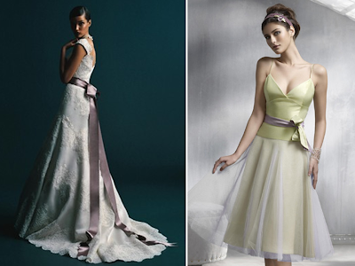 Just because you're infusing a chocolate and brown color scheme throughout every aspect of your wedding, including the silk rose petals ... just because the same lace pattern on your gown will be applied to the table linens and handkerchief you're gifting your mom ... just because you'll affix your monogram to the save-the-dates, invitations, favors, programs, menu cards, gartar and wedding cake ... it doesn't mean you have to be as matchy-matchy with your choice of bridesmaid dresses. It's widely accepted to not have your sisters and/or best friends in the same exact dress or in the same exact color. Yes, it's okay to mix it up! As long as the bridesmaid dresses you choose complement the bridal gown, you can't really go wrong.